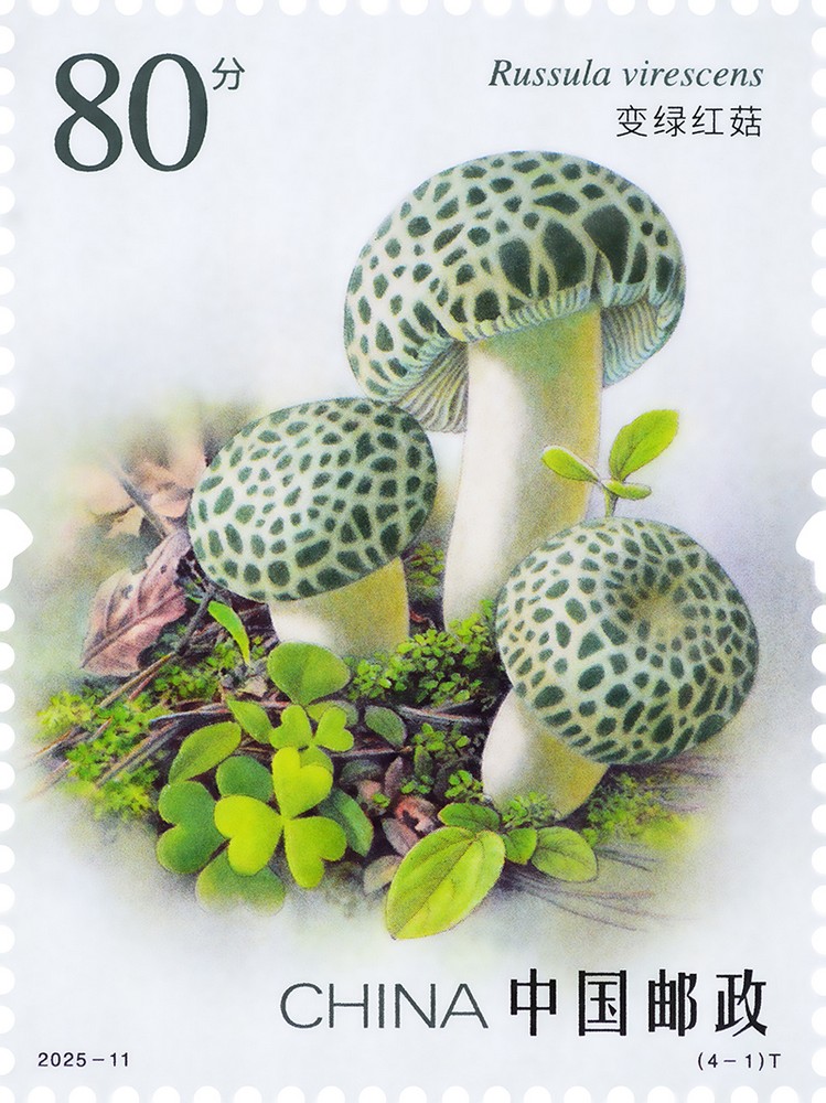 第一枚“變綠紅菇”,俗稱“青頭菌”,隸屬紅菇科。菌蓋較硬,呈青綠色,表面有青褐色的鱗片。其分布廣泛,鮮美的口感深受人們喜愛。郵票設計突出其青翠欲滴的色澤,并融入森林生態背景,使整體形象兼具自然野趣與美學韻味。