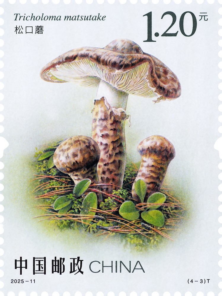 第三枚“松口蘑”,俗稱“松茸”,隸屬口蘑科,是世界公認的珍稀名貴天然食用菌,同時也是我國二級瀕危保護物種。松口蘑歷來被譽為食用菌中的瑰寶,享有“蘑菇之王”的美譽,珍貴無比。郵票采用細致的筆法刻畫松口蘑菌蓋表面的細微紋理及菌柄的粗壯形態,同時背景加入松林元素,以柔和的光影表現其生長環境,增強畫面的自然氛圍。