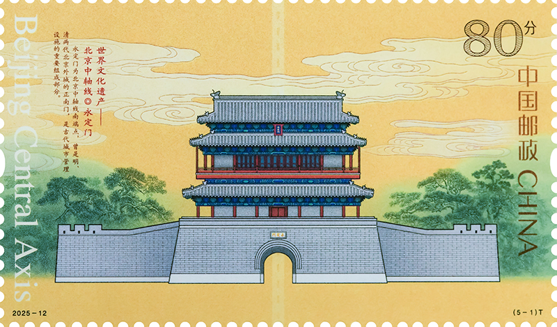中國郵政定于2025年7月27日發(fā)行《世界文化遺產(chǎn)——北京中軸線》特種郵票1套5枚。郵票圖案名稱為:永定門、正陽門、天安門、故宮·景山、鐘鼓樓。全套郵票面值5.50元。郵票計(jì)劃發(fā)行數(shù)量為套票570萬套,版式二69.3萬版。